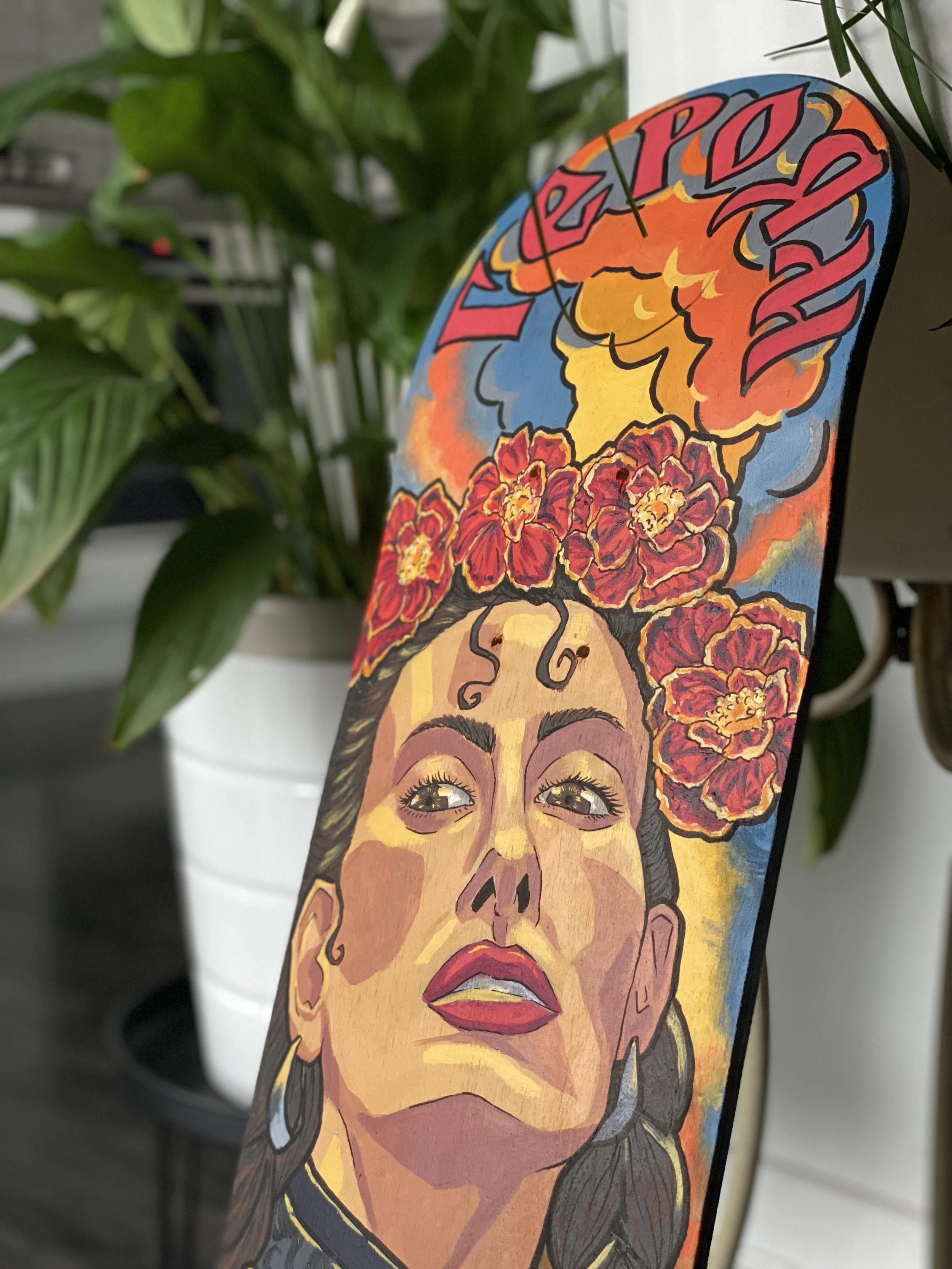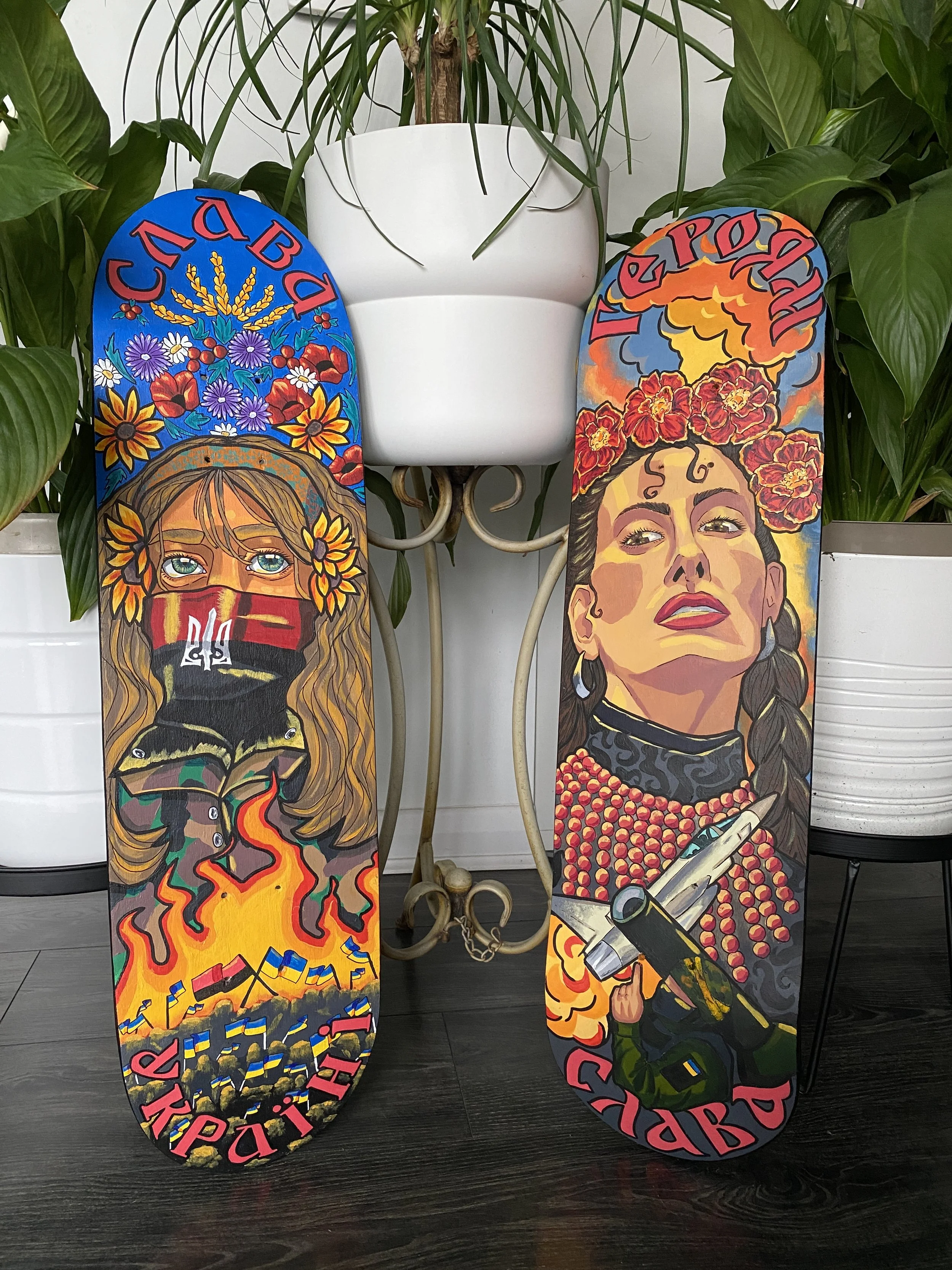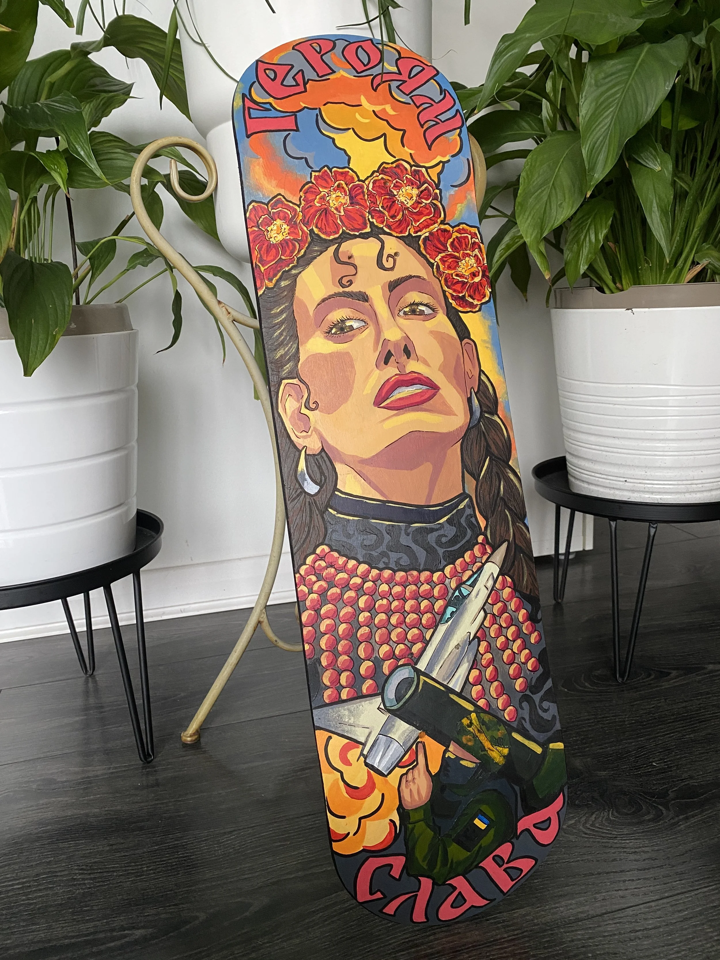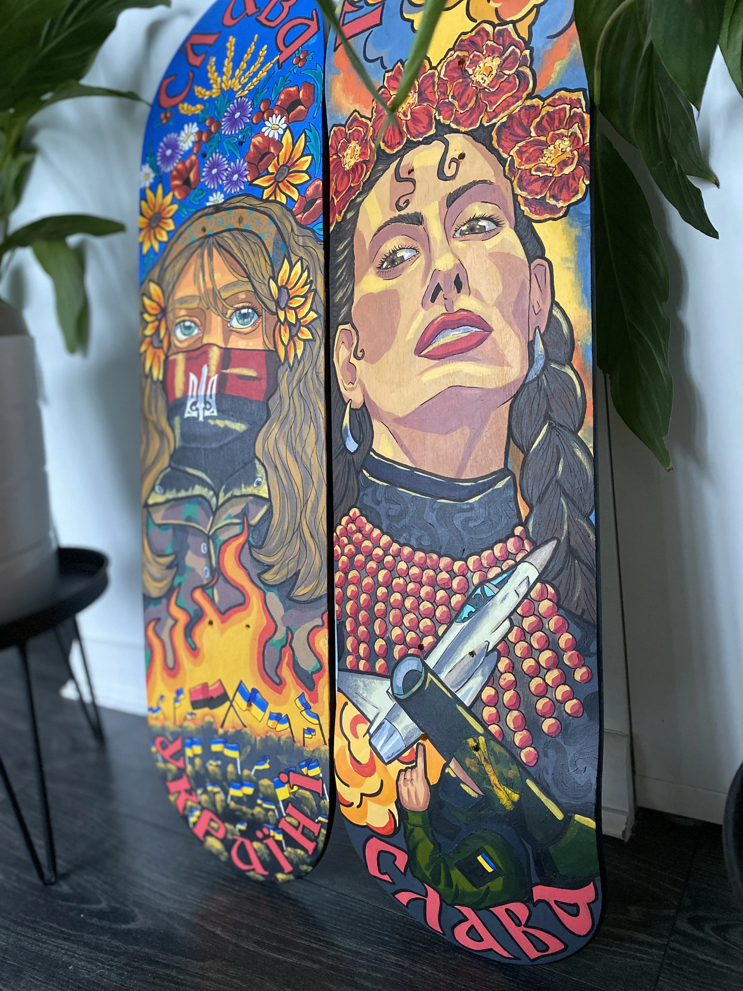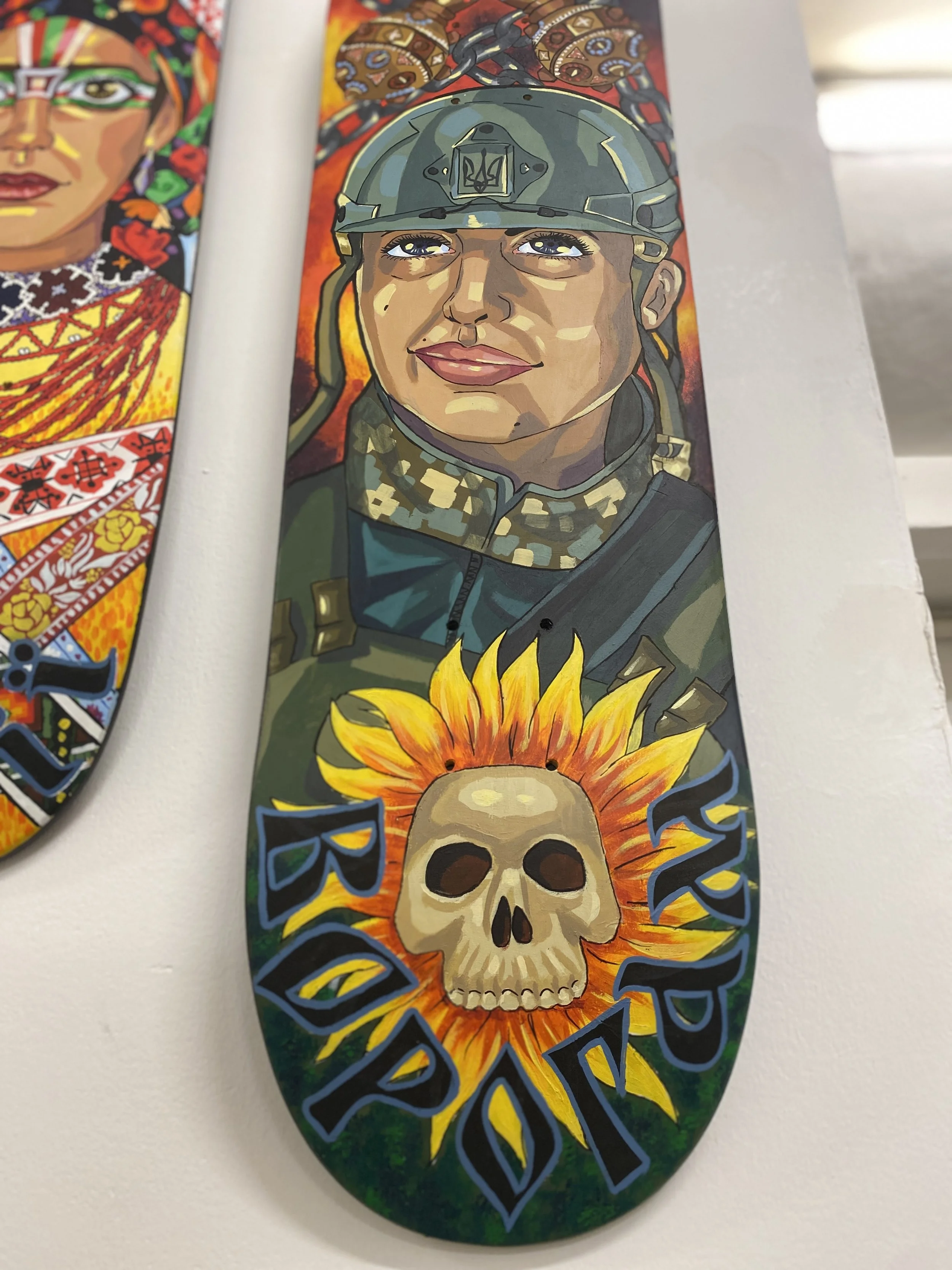 The skateboard series is a collection of painting that focuses on different aspects of Ukrainian culture, and aesthetics. Initially this series started with the first skateboard being dedicated to the events of 2014; the annexation of Crimea and the Euromaidan protests. I wanted to capture the energy of Ukraine wanting to break away from a pro-Russian government and how when our people come together, we are a force to be reckoned with. The other focal point of this piece was the text, Slava Ukraini which means ‘Glory to Ukraine.’ In Ukraine we say this phrase and we have a response – Heroyam Slava ‘Glory to our heroes.’ This is a very important call and response, to which everyone shows respect to those who have fallen for the preservation and future of our nation and culture.
